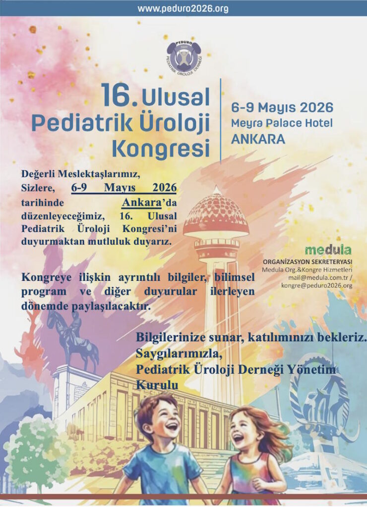 Sizlere, 6-9 Mayıs 2026 tarihinde Ankara‘da düzenleyeceğimiz, 16. Ulusal Pediatrik Üroloji Kongresi’ni duyurmaktan mutluluk duyarız.